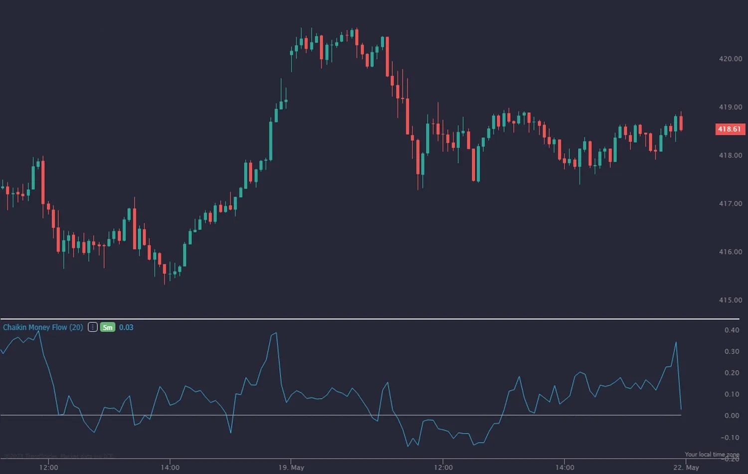 اندیکاتور CMF به عنوان یک نوساننمای محدود عمل میکند و مقدار آن همواره بین -۱.۰ تا +۱.۰ نوسان دارد. مقادیر مثبت بیانگر ورود پول به بازار (فشار خرید) و مقادیر منفی نشانهی خروج نقدینگی (فشار فروش) هستند.