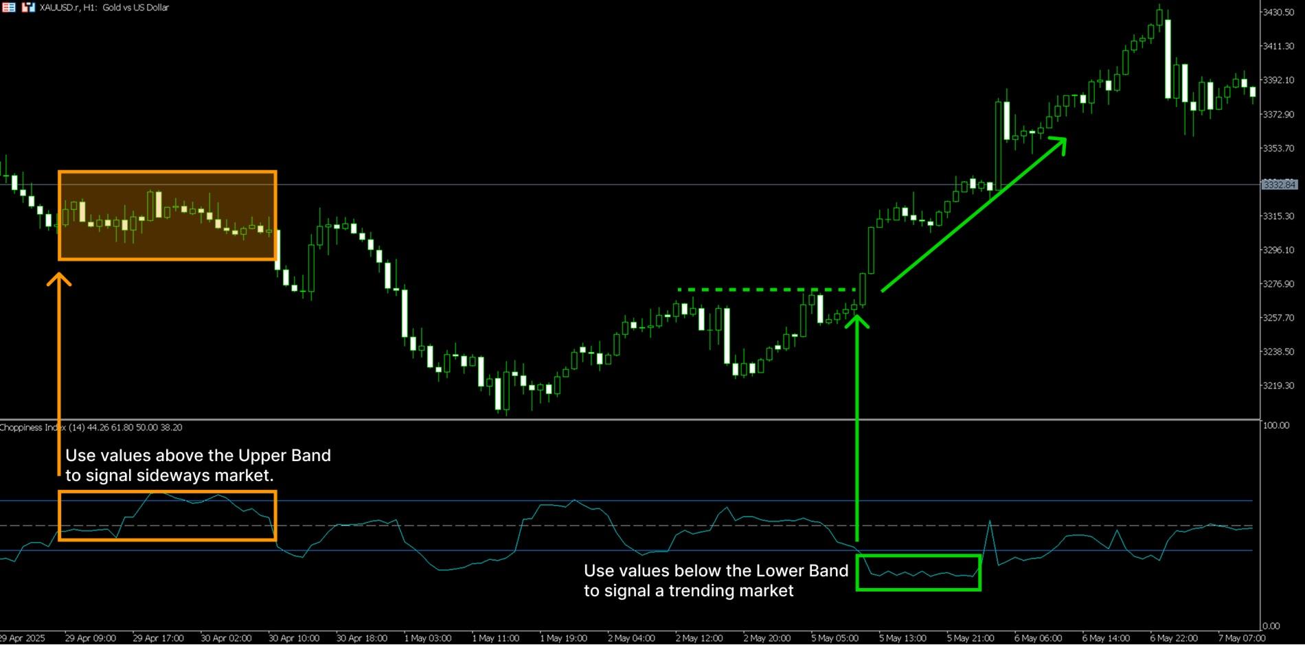 قویترین کاربرد CI، شناسایی بازارهایی است که در حال خروج از یک فاز خردشده و ورود به یک فاز روندمند هستند. زمانی که CI به سطوح افراطی بالا (مانند ۷۰ تا ۹۰) میرسد و برای مدتی در آنجا تثبیت میشود، نشاندهنده یک بازار بسیار خردشده و خنثی است؛ طبق آمار، این وضعیت پیشدرآمد یک حرکت قوی و بنیادین است و تریدرها در این حالت آماده میشوند تا با شکست قیمت از محدوده خنثی، وارد معامله شوند. سیگنال شروع روند زمانی صادر میشود که CI از این منطقه افراطی بالا به سمت پایین حرکت کرده و همزمان قیمت از محدوده تثبیت شده خود خارج شود. عبور CI به زیر ۶۱.۸ (سطح فیبوناچی) به عنوان یک سیگنال اساسی برای آغاز روند تلقی میشود و در این حالت، تریدر میتواند با اطمینان بیشتری بر اساس عمل قیمت (Price Action) معامله کند.