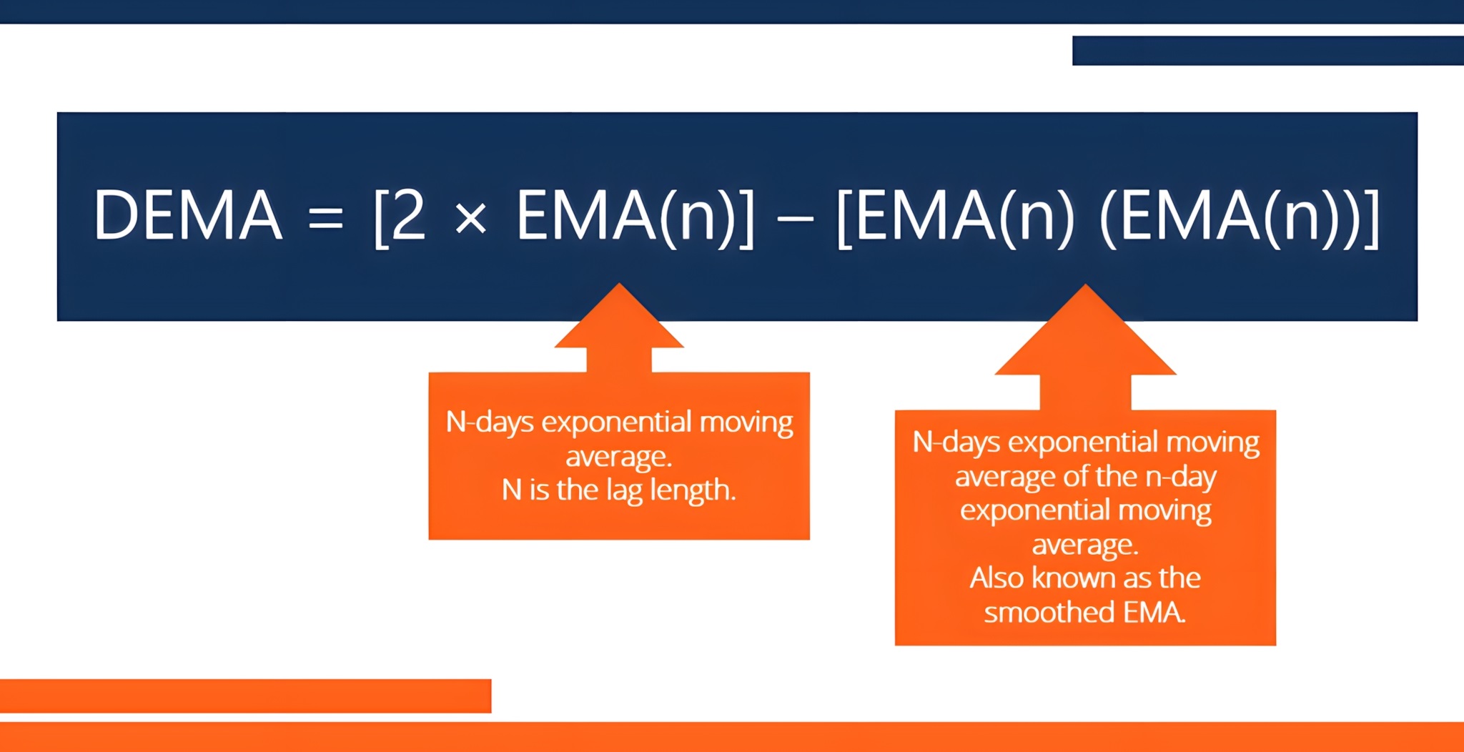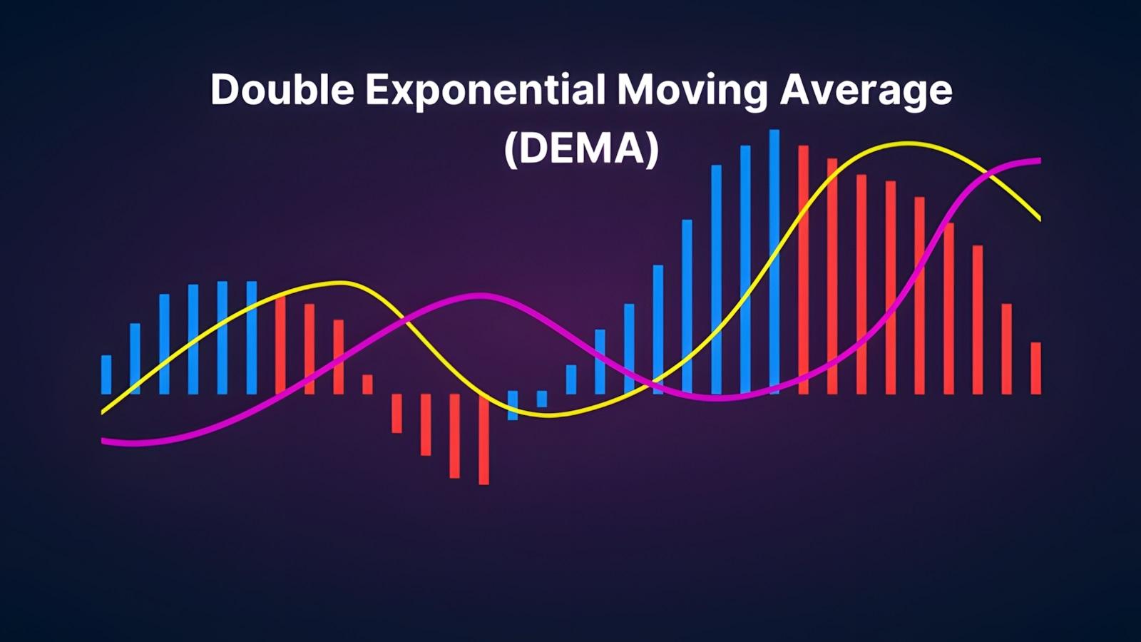 در نهایت، DEMA با استفاده از یک فرمول کسر تأخیر محاسبه میشود. این فرمول، دو برابر EMA1 را با EMA2 ترکیب میکند تا تأخیر EMA2 را از EMA1 حذف کند و یک خط بسیار واکنشگر تولید کند. «(DEMA = 2 × EMA₁ − EMA₂)»